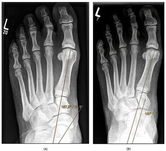 Pre- and post-operative radiographic findings of double arthrodesis, left foot. (a) Anteroposterior view pre-operative, (b) anteroposterior view post-operative.