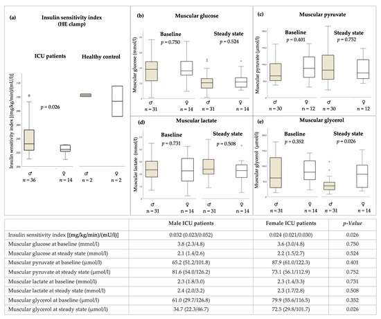 The metabolite of fatty acid metabolism glycerol was significantly higher in female ICU patients during HE clamp at the steady state (p = 0.026) (Figure 1e).