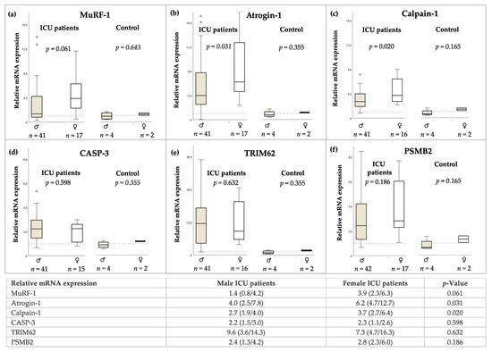 Surgical muscle biopsies were extracted at median Day 15. The relative mRNA expression of protein degradation atrogenes compared to healthy controls is shown in Figure 2. Relative gene expression of the protein degradation atrogenes Atrogin-1 (p = 0.031) (Figure 2b) and Calpain-1 (p = 0.020) (Figure 2c) was higher in female ICU patients. Gene expression for atrogenes MuRF-1 (Figure 2a), CASP-3 (Figure 2d), TRIM62 (Figure 2e), and PSMB2 (Figure 2f) was probable in male and female patients. No differences were found in healthy control subjects. Sex was not significantly associated with muscle atrophy gene expression of Calpain-1 and Atrogin-1 in the unadjusted linear regression model and adjusted for age. Details are shown in Table S2.