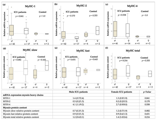 No sex differences were observed in the relative mRNA expression of myosin heavy chains (Figure 3a–c) and relative myosin protein content (Figure 3d–f) in ICU patients or healthy control patients.