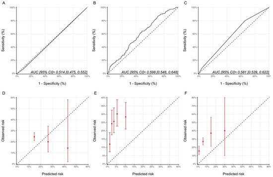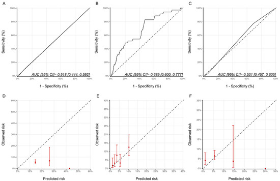 Discrimination and calibration of the risk models using the ESC CTRCD definition. ROC curves and calibration plots for the Ezaz model (A,D), NSABP-31 CRS (B,E), and HFA-ICOS proformas (C,F). Please see the caption of Figure 1 for additional information regarding the figure. ESC, European Society of Cardiology; NSABP31-CRS, National Surgical Adjuvant Breast and Bowel Project B-31 cardiac risk score; HFA-ICOS Proforma, Heart Failure Association of the European Society of Cardiology-International Cardio-Oncology Society Proforma; AUC, area under curve; ROC Curve, receiver operating characteristic curves.
