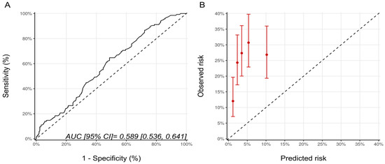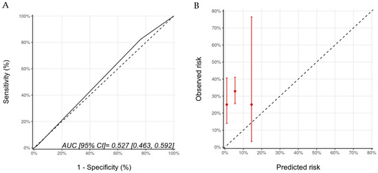 As Ezaz et al. developed their model in women 67 years of age and older, we repeated the analysis only in these older patients from our cohort (n = 64). There were 45, 15, and 4 patients with low-, medium-, and high-risk categories of whom 15 (33.3%), 4 (26.7%), and 1 patient (25%), respectively, developed CTRCD (p = 0.856). Despite this alignment of the model development and validation cohorts, the model discrimination was poor (AUC (95% CI) 0.44 [0.30–0.58]), and the calibration remained suboptimal (Figure 2). The wide 95% confidence intervals reflect the small sample size of this subgroup.