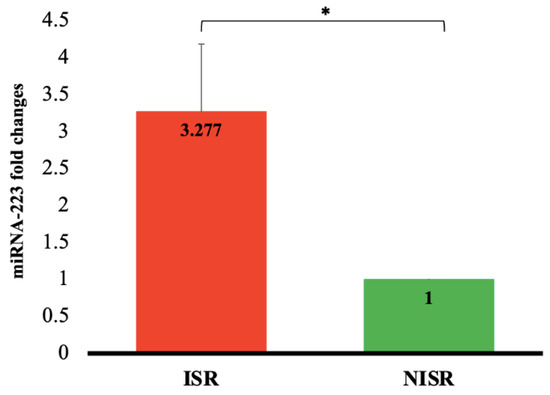 Serum miRNA-223 fold change expression in ISR patients related to NISR as a control group. Data are expressed as mean ± SE. * p < 0.05.