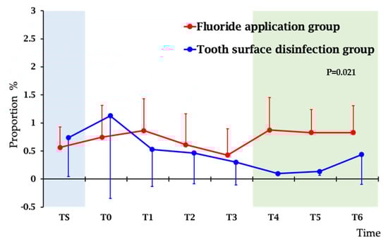 The baseline characteristics of the subjects participated in this study were shown in Table S1. No statistically significant differences were observed in demographic and clinical parameters between fluoride application group and tooth surface disinfection group.