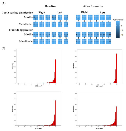 The graphs in upper row show tooth surface disinfection group and the in lower row show Fluoride application group. The left columns show baseline and the right column shows after six months. The changes of ΔQ value were illustrated by histogram by baseline and after six months. Tooth surface disinfection group clearly reduced the ΔQ value when compared with Fluoride application group. In heatmap, the lighter the color, the smaller the volume of WSLs. The four parameters (White spot area (mm2), ΔF (%), ΔFmax (%), ΔQ (% × mm2)) were evaluated, and this figure shows the change in volume (ΔQ (% × mm2) as a representative. The changes of other parameters are shown in the Figure S4.