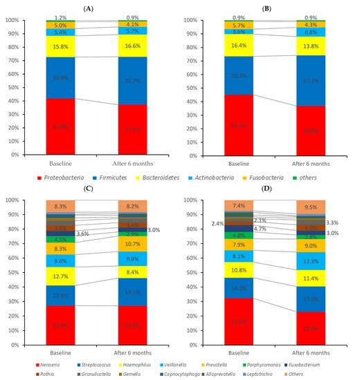 Oral microbiome structure before and after treatment. Data are presented separately phylum, and genus level. (A) Tooth surface disinfection group at phylum level. (B) Fluoride application group at phylum level. (C) Tooth surface disinfection group at genius level. (D) Fluoride application group at genus level.