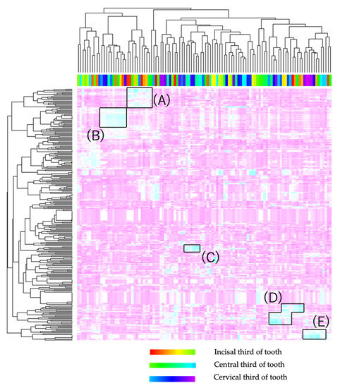 Correlation heatmap of ΔQ value and species. The order of tooth surface in legend is maxillary to mandibular, right to left, distal to mesial. Detailed correlations are shown in the Table S8. Sky blue area indicate positive correlations. Some of the sky-blue area contains site specific species: Aggregatibacter, Alloprevotella, Anaerococcus, Bifidobacterium, Porphyromonas, Prevotella, Treponemma, Vagococcus, Veillonella, and Streptococci. (A–E): Cluster of highly positive correlation between WSLs and species.