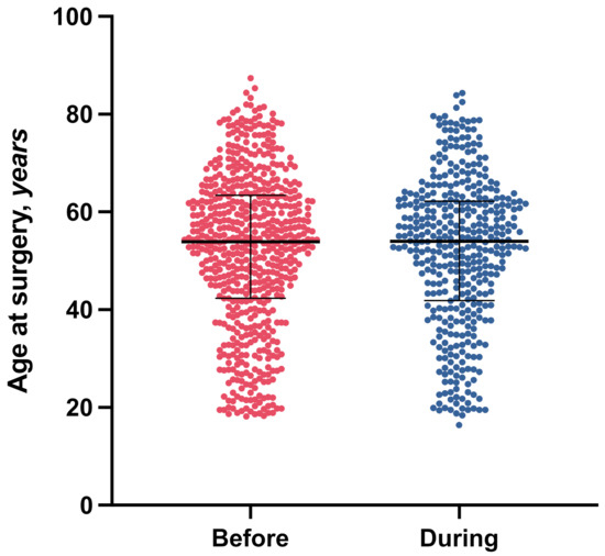 The sample before the pandemic included 616 patients (median age at first implantation: 54.0 years, interquartile range: 42.5–63.5, 53% female, 19% smokers) and 1204 implants (80 implants per month, 47% maxilla). The number of implants per patient ranged from 1 (n = 320) to 11 (n = 2), with an average of 2.0 implants per patient. The mean implant diameter was 4.1 ± 0.5 mm. The mean implant length was 11.0 ± 1.2 mm. A detailed description of the samples is shown in Table 1, and age distributions are shown in Figure 1.