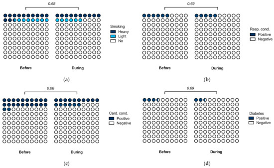 First, we compared patient parameters between the samples. There were 339 non-smokers (84%), 24 light smokers (fewer than 10 cigarettes per day, 6%), and 41 heavy smokers (at least 10 cigarettes per day, 10%) during the pandemic, compared to 493 non-smokers (80%), 46 light smokers (7%), and 76 heavy smokers (12%) before the pandemic (p = 0.68) (Figure 2a). Respiratory conditions were reported by 21 patients (5%) during the pandemic, compared to 37 patients (6%) before the pandemic (p = 0.69) (Figure 2b). Cardiovascular conditions were reported by 64 patients (16%) during the pandemic, compared to 137 patients (22%) before the pandemic (p = 0.06) (Figure 2c). Diabetes was reported by 11 patients (3%) during the pandemic, compared to 22 patients (4%) before the pandemic (p = 0.69) (Figure 2d). Taken together, the data suggest that the populations treated during and before the pandemic were largely comparable. While there were fewer cardiovascular conditions reported during the pandemic, this difference was not significant.