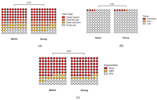 There were 469 implants placed without bone augmentation (67%), 82 implants placed with guided bone regeneration (12%), and 145 implants placed with sinus floor elevation (21%) during the pandemic, compared with 783 implants placed without bone augmentation (35%), 213 implants placed with guided bone regeneration (18%), and 208 implants placed with sinus floor elevation (17%) before the pandemic (p = 0.01) (Figure 3c). Taken together, the data suggest a significant difference in the use of bone augmentation, but no differences were found between the types of edentulous spaces as well as the timing of implant placements performed during and before the pandemic.