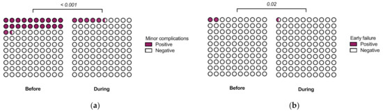Finally, we compared postoperative complications between the sample. Minor complications included bleeding or suppuration, swelling, local infection, hematoma, as well as temporary neurosensory disturbance. These occurred in 23 patients (6%) and affected 42 (6%) of the implants during the pandemic, compared to 133 patients (22%) and 261 implants (22%) before the pandemic (p < 0.001 at the patient level) (Figure 4a). A total of 3 implants failed before loading (<1%) during the pandemic, compared to 26 implants (2%) before the pandemic (p = 0.02) (Figure 4b). Taken together, the data suggest a significantly lower prevalence of postoperative complications, including early implant failure, between treatments during and before the pandemic.