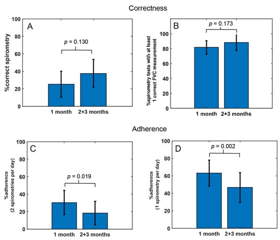 Compliance analysis of pulmonary function telemonitoring. Correctness: (A) percentage of the correct examinations (ATS/ERS 2019) []; (B) percentage of the exams with at least one corrected measurement. Adherence: (C) percentage of the days with at least two examinations/total number of the days ((30 or 60 days) × 100%); (D) percentage of the days with at least one measurement/total number of the days ((30 or 60 days) × 100%).
