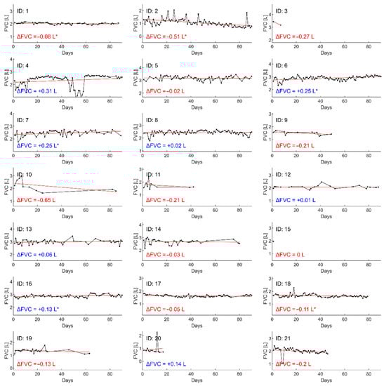 Daily forced vital capacity (FVC (L) charts with a matched straight line for individual participants. Change in spirometry parameter values (ΔFVC) over 90 days was calculated using linear regression for each parameter. After fitting a straight line, the difference at d = 90 days (or last day of monitoring) and day = 0 was calculated. Symbol * means that the slope coefficient of the fitted lines is significantly different from zero (p-value < 0.05).