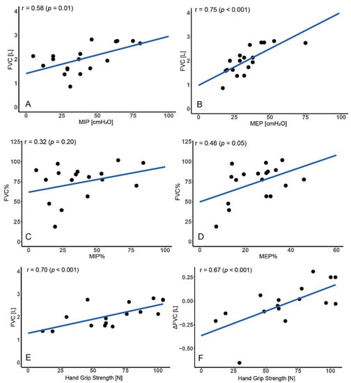 Relationship between forced vital capacity (FVC) and (A,B) maximal inspiratory pressure (MIP); (C,D) maximal expiratory pressure (MEP); (E,F) handgrip strength.