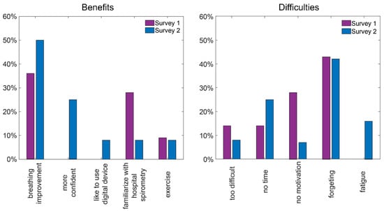 The ratings of general satisfaction varied from five to three for Survey One and from five to four for Survey Two. The mean general satisfaction rating of the home spirometry was 4.46/5 (SD 0.66) in Survey One and 4.91/5 (SD 0.28) in Survey Two. There was no significant difference between general satisfaction in Surveys One and Two (p = 0.095). Benefits from the home spirometry were visible for 80% of respondents in Survey One and all respondents in Survey Two. Breathing improvement was indicated as the most important benefit from the telemonitoring pulmonary function for more respondents (Figure 4). The most common reason for irregular measurements was forgetting about the procedures. The patients reported increased motivation but less time to perform tests. Reasons for benefits and irregular measurements reported by the participants in Surveys One and Two are presented in Figure 4.
