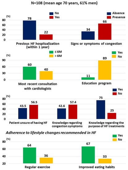 Nearly half of the patients (40%) had not consulted their cardiologist within the last 6 months. More than half of the patients were unsure whether they had HF (56.5%) and lacked knowledge regarding the self-assessment of symptoms of congestion (57.4%). One-quarter (25%) were uncertain as to the purpose of HF medications.