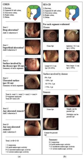 The two main endoscopic scores validated for CD are the Crohn’s Disease Index of Severity (CDEIS) and the Simple Endoscopic Score for Crohn’s Disease (SES-CD) (Figure 2) [21,22]. CDEIS evaluates five segments of the intestine: rectum, sigmoid, left, traverse and right colon and ileum. In each segment, the endoscopist records the presence of deep or superficial ulcers, the percentage of surface ulcerated or involved by disease and the presence of ulcerated or non-ulcerated stenosis. A score is assigned for each element and summed to a total ranging from 0 (not active disease) to 44 (severe disease) [21]. Similarly, the SES-CD evaluates four endoscopic items (ulcer size, percentage of ulcerated surface, proportion of the surface area affected by disease and the presence of stenosis) in the same five anatomical locations. Each element is weighted, and a score is assigned from 0 to 56 [22].