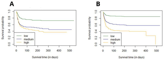 The survival curves for groups were estimated using Kaplan–Meier functions, based on the original stratification-low/medium/high for 0–1/2–3/≥4 points, respectively. The p value for the Log-rank test was <0.0001 (Figure 4). The estimated six-month survival probability for high-risk subjects reached 0.4 in both cohorts whereas for the low-risk group, the six-month survival probability was 0.7 in the diabetic vs. 0.85 in the non-diabetic group—levels which were maintained during whole observation period.