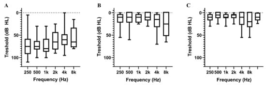 The mean pure tone threshold for each frequency: (A) pure tone threshold of the affected ear at initial presentation, (B) pure tone threshold after recovery, (C) unaffected side. The line with dots meant the 0 dB HL.