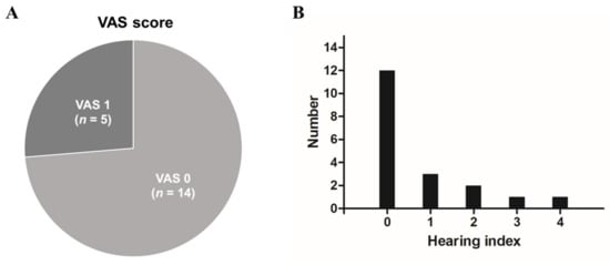 Figure 3 shows the results of the hearing questionnaire. In terms of subjective symptoms seen from the VAS score, 14 patients (73.7%) answered with a score of 0, which is normal hearing. On the other hand, 5 patients (26.3%) scored 1, indicating that they still felt mild hearing loss even though the pure tone threshold was normal. However, none of the patients complained of severe hearing loss, with a VAS score of 2 or more. When asked through the hearing index about situations in which they felt discomfort in daily life, 12 patients (63.2%) did not complain of discomfort in any of the situations, whereas 3 patients (15.8%) responded that they felt discomfort in one situation, 2 patients (10.5%) in 2 situations, 1 patient (5.3%) in 3 situations and 1 patient (5.3%) in all situations.