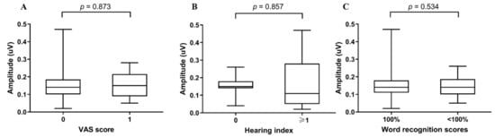 Box and whisker plots of ABR amplitude of wave I according to (A) VAS score, (B) hearing index and (C) word recognition scores.