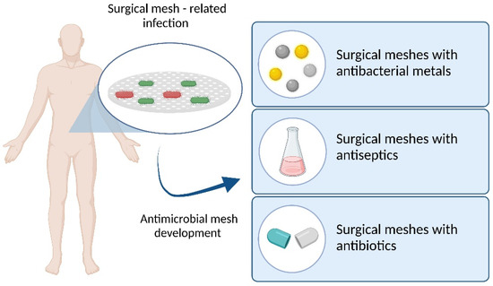 In this review, the latest achievements in the field of antimicrobial surgical meshes are presented and discussed. The burden of mesh-related infections is highlighted and different types of meshes with antimicrobial agents are presented, together with their advantages and disadvantages. The meshes presented in this work are divided into three categories: meshes with antimicrobial metals, meshes with antiseptics, and meshes with antibiotics (Figure 1).