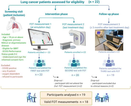 Choosing SBRT instead of surgery is mostly due to clinico-pathological criteria, but a certain amount of patients with NSCLC might be intolerant to surgical resections due to impaired pulmonary function. Possible extensions include pulmonary function tests such as FOT, which provide information about lung capacity and tissue mechanics [36,54]. Measurements of lung function with non-invasive devices (i.e., FOT) in fragile patients with lung cancer would help to determine the functional consequences of irradiating small fields in lungs and establish evidence based criteria for eligibility for SBRT schemes on the basis of lung function. Further research should be undertaken to investigate the influence of the presence of other medical respiratory conditions (e.g., chronic obstructive pulmonary disease) on the treatment outcome.