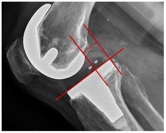 In CR TKA, the PCL limits posterior tibial translation (PTT) during flexion and extension [3,6]. Hence, the integrity of the PCL is essential, and the ligament must not be sacrificed [7]. CR implants should be avoided when PCL insufficiency is present, and in patients with an increased risk of developing a posterior instability. In these cases, a posterior stabilized (PS) implant which substitutes the PCL should be utilized [8]. However, even when the PCL is intact before surgery, some conditions can reduce the integrity of the PCL during or after surgery. Direct iatrogenic damage can occur during primary TKA by harming or even resecting the PCL. Some studies have shown that the insertion of the PCL can be damaged when performing the tibial cut [9,10,11]. Indirect iatrogenic damage can occur if the PCL and the collateral ligaments are not well balanced. Despite this, a careful review of the current literature reveals that reports on PCL insufficiency in patients after primary CR TKA are rare. This might be because clinical examination and standard radiographs are often not sensitive enough to detect a PCL insufficiency [4]. Stress radiographs (30° and 90° flexion) are the gold standard in the quantification of posterior instability [12,13,14]. As the PCL performs its stabilizing function mainly between 60° and 120° flexion, posterior drawer testing at 30° flexion may not accurately show anteroposterior instability [15]. Stress radiographs at 90° flexion could help to identify the instability and quantify the amount of posterior translation.