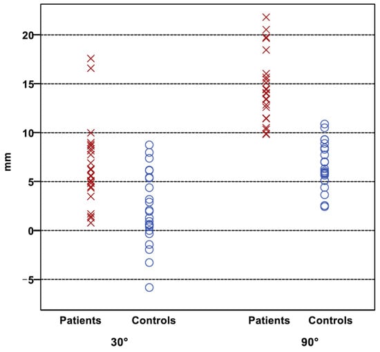 Distribution of the PTT of the patients (cross) and the control group (circle). There is a better discrimination between both groups at 90°, indicating a cut-off value at 10 mm.