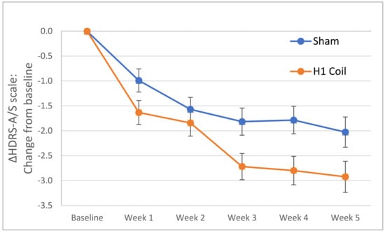 Change (i.e., Δ) in HDRS Anxiety/Somatization (HDRS-A/S) score from baseline to the primary study endpoint (week 5) for the H1 Coil and Sham arms in the per-protocol analysis (pivotal multicenter RCT []). The positive influence of the H1 Coil treatment on the anxiety score is seen to develop from the first post-baseline measurement, and the performance is consistently improved over the Sham arm. Error bars are ± standard errors in the mean (SEM).