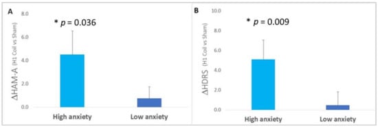 Baseline anxiety: When isolating the subjects with “high” levels of baseline anxiety based on the pre-selected HAM-A cutoff, the unadjusted between-group (i.e., H1 Coil vs. sham) difference (Δ = 4.52 [0.55, 8.49]) was found to be statistically significant (p = 0.036) with an effect size of 0.65 [0.07, 1.20], representing a medium effect. The corresponding group differences in the HDRS-21 rating scores were also significant (Δ = 5.10 [1.25, 8.95], p = 0.009) with an effect size of 0.75 [0.17, 1.31], representing a medium effect. This can be contrasted with values obtained for the group of subjects with “low” levels of baseline comorbid anxiety, for which neither HAM-A nor HDRS-21 rating scales showed a significant between-group difference (HAM-A rating scale: Δ = 0.76 [−1.20, 2.72] points, p = 0.61, E.S. = 0.16 [−0.25, 0.56]; HDRS-21 rating scale: Δ = 0.48 [−2.18, 3.14] points, p = 0.70, E.S. = 0.07 [−0.33, 0.48]). See Figure 2.