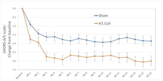 Between-group change in HDRS Anxiety/Somatization (HDRS-A/S) score from baseline to the final rating at week 16 for the H1 Coil and the Sham arms in the per-protocol analysis (pivotal multi-center RCT []). Daily treatments until the end of week 4 were followed by bi-weekly treatments for 12 weeks. Missing values were corrected with LOCF imputation. The treatment effect is shown to be sustained from the primary study endpoint until the final rating at week 16. Error bars are ± standard errors in the mean (SEM).
