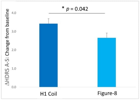 Within-group (i.e., Baseline–Endpoint) comparison of changes in HDRS-A/S rating scale over the course of the treatment in the head-to-head clinical trial [] for the two TMS coil treatment arms (H1 Coil and Figure-8). The results indicate a significant difference in the treatment-induced changes in anxiety-related symptoms, with the improvement following H1 Coil treatment significantly larger than the improvement following Figure-8 Coil treatment (p = 0.042). Error bars are ± SEM. * indicates a significant between-group difference (p < 0.05).