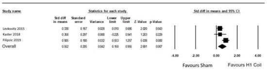 Following the evaluation of the pivotal multicenter data, this data were combined with two other RCTs that also used the H1 Coil to treat depression (see Table 1)—an independent head-to-head study comparing H1 Coil to Figure-8 Coil [] and a trial carried out in subjects with late-life depression (LLD) []. The stimulation protocols were identical except for the number of daily pulses for the LLD study, which employed an extended protocol of 6012 pulses/day, and in the medication-free status of the pivotal multicenter trial. The data from these studies were collated, and a meta-analysis was performed to obtain an overall effect size.