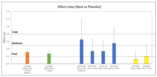 Summary of between-group (i.e., real vs. placebo) effect sizes described in this report that evaluate the changes of anxiety symptoms in primary (GAD) and secondary (MDD) disorders relative to placebo treatment. All values are based on the HDRS-A/S factor scale and concern the treatment of MDD, unless otherwise indicated. Studies are as follows (left-right): (i) Medications in GAD RCTs based on HAMA-A rating scale (Section 3.2.2, also Supplementary material Figure S2); (ii) Medications in anxious depression RCTs (Section 3.2.2, also Supplementary material Figure S1); (iii) H1 Coil data from the pivotal MDD RCT [] based on the HAMA-A rating scale for the sub-group with high anxiety at baseline defined by HAM-A ≥ 21 (Section 3.1.1); (iv) H1 Coil data from pivotal MDD RCT (Section 3.1.1); (v) Two MDD RCTs using H1 Coil (Section 3.1.3) [,]; (vi) Three MDD RCTs using H1 Coil (Section 3.1.3 and Figure 5) [,,]; (vii) Figure-8 Coil data from Neuronetics registration MDD RCT [] (Section 3.2.1); (viii) Figure-8 Coil data from OPT-TMS MDD RCT [] (Section 3.2.1). Error bars indicate the extent of the upper bound of the 95% confidence interval. The accepted limits of small (0.2), moderate (0.5), and large (0.8) effect sizes for Cohen’s d are indicated (horizontal dotted lines). N = number of trials. n = number of subjects.