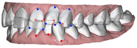 Anterior teeth landmarks in the maxillary (blue circles) and mandibular (red circles) arches. Only landmarks of the left side are shown.