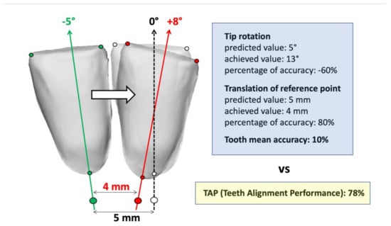 The development of digital systems and efficient surface-to-surface matching algorithms have been previously used by some authors to segment the teeth crowns before the treatment and superimpose them to the post-treatment predicted and achieved virtual models, obtaining a transformation matrix describing the roto-translation that occurred [,,,,,]. However, these studies reported values of teeth rotation and/or translation without describing the landmarks used to create each tooth reference system, which makes it impossible to replicate their calculations for a direct comparison with the TAP score. In addition, when the corresponding percentage accuracy indices are reported [,], their calculations are liable to provide negative values (Figure 3) or be unapplicable due to mathematical singularity (when the predicted value of a movement component is null, but the orthodontic device induces its change). In addition, when attempting to provide an average accuracy index, the authors pooled together the mean values of movement accuracies obtained from angles and distances, which would be misleading to interpret as an overall movement accuracy; for example, when the planned tooth movement is mainly a translation to close an important gap, a small concomitant rotation that is only partially achieved would have an excessive detrimental impact on the overall mean percentage accuracy (Figure 3).