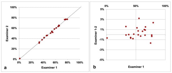 Scatter plot with the identity line (a) and Bland-Altman plot (b) showing the comparison between the TAP (Teeth Alignment Performance) values provided by the two examiners from the 22 analyzed arches.