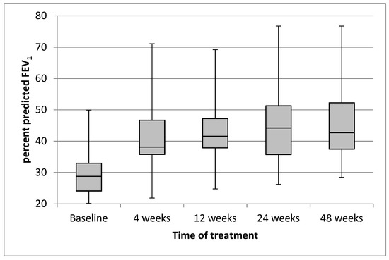 Effect of treatment with elexacaftor/tezacaftor/ivacaftor on percentage of predicted FEV1 from baseline through to week 48. Each box and whisker plot shows the position of the minimum, lower quartile, median, upper quartile, and maximum of the data, at baseline and at different times of treatment.