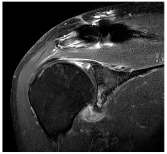 Typical findings on magnetic resonance imaging (MRI) in patients with painful shoulder stiffness. High signal intensity is observed in thickened joint capsule, which is emphasized on axillary capsular pouch.