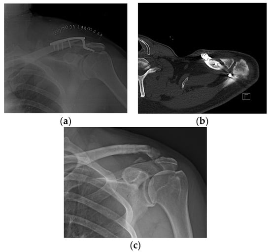 Incomplete union. (a) A 57-year-old male patient 4 months after hook plate fixation. (b) The plate is removed after incomplete union on patient request. (c) Bone union is achieved during follow-up.