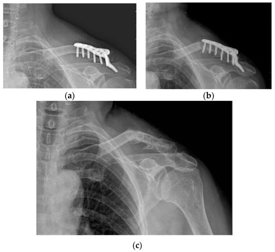 All surgeries were performed by a single surgeon (Hyun YS) using two types of AO hook plates—AO clavicular hook plate (Synthes, Raynham, MA, USA) and VariAx lateral hook plate (Stryker, Selzach, Switzerland). The only difference between the two metal plates is the difference in the angle of the hook part. The angle of hook is 90 degrees in the AO clavicular hook plate and 110 degrees in the VariAx lateral hook plate. According to the PDF file from the official website of Stryker, the hook of VariAx lateral hook plate is anatomically pre-contoured to fit the inferior aspect of the acromion. In several previous studies, the authors emphasized the complications can be minimized by performing an anatomic fit of the plate during the procedure and found it necessary to bend the hook [,,]. Pre-contouring of 20 degrees in the VariAx lateral hook plate is thought to be influenced or reflect these previous research results [,,]. In order to match the hook part of the metal plate with the lower edge of the acromion as much as possible, the special fluoroscopic view technique we developed was utilized for the best fit between the hook and the acromion, which was helpful in reducing the inevitable acromial erosion []. During the surgical procedure for DCF, at least one screw was inserted into the lateral fractured fragment to fix it. If it was thought that the screw insertion was insufficient, the metal plate and the lateral fractured fragment were wound together with wire and fixed.