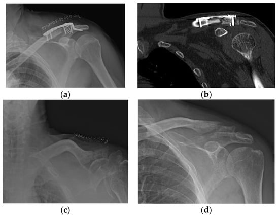 Acromial fracture. (a,b) Acromial fracture may be developed by frictional movement between the hook and the acromion; (c,d) fracture healing is shown without any additional procedure.