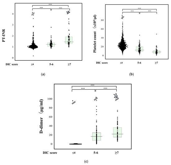 PT-INR (a), platelet counts (b), and D-dimer (c) DIC, disseminated intravascular coagulation; PT-INR, prothrombin time–international normalized ratio. ***, p < 0.001.