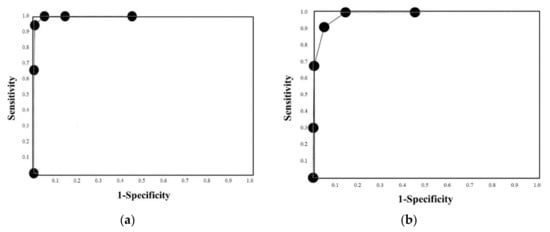 The D-dimer levels in patients with DIC (25.0 μg/mL: 16.1–47.8 μg/mL) were significantly higher than those in patients with pre-DIC (17.0 μg/mL: 8.2–25.7 μg/mL) or non-DIC (1.7 μg/mL: 0.7–4.8 μg/mL), and in those with pre-DIC than in those with non-DIC (Figure 1c). Regarding the ROC analysis of DIC vs. non-DIC, the adequate cut-off value was 10.0 μg/mL, the sensitivity and specificity were 93.1% and 92.5%, respectively, and the AUC and NPV were 0.971 and 99.6%.
