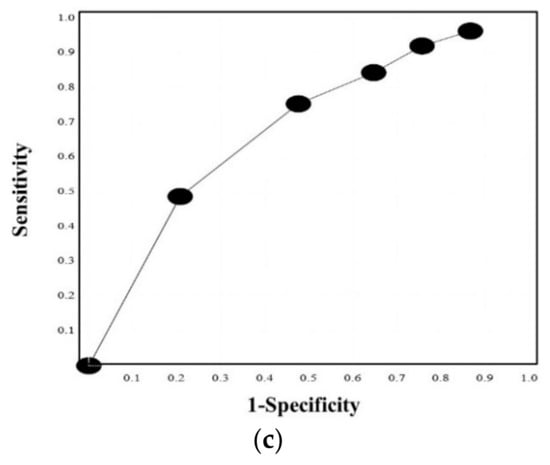 Based on the above results, we propose the quick DIC score system (Table 4). When these patients were evaluated using the quick DIC score system, all patients with DIC had a quick DIC score of ≥3 points, 85.3% of patients with pre-DIC had a score of ≥3 points, and all patients with pre-DIC had a score of ≥2 points (Figure 2). Regarding the ROC analysis (Figure 3a,b), the AUC was 0.997 for DIC vs. non-DIC, and 0.984 for pre-DIC + DIC vs. non-DIC, and the cut-off value was 3 points for DIC and 2 points for DIC + pre-DIC (Table 4). The quick DIC scores of non-survivors (2.0 points: 1.0–3.0 points) were significantly higher than those of survivors (1 point: 0–1.0 points). Regarding the ROC analysis of survival (Figure 3c), the AUC was 0.685 and the adequate cut-off value was 2 points (Table 5).