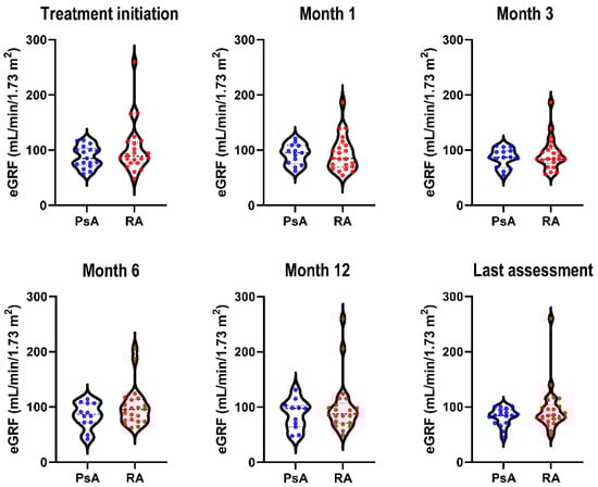 Distribution of estimated glomerular filtration rate in patients with psoriatic arthritis (PsA) or rheumatoid arthritis (RA) over 12 months of treatment. eGFR, estimated glomerular filtration rate.