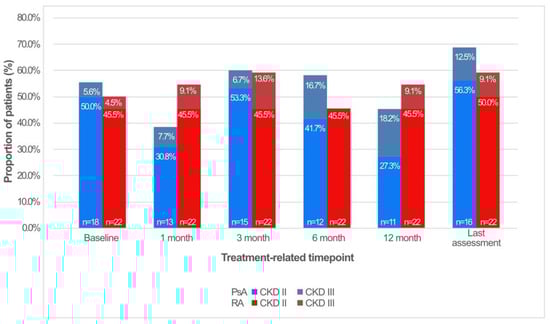 Renal disease can also occur in patients with psoriatic arthritis (PsA) but at a lower prevalence than in RA patients []. In patients with autoimmune inflammatory disease, the development of renal dysfunction is a concern for a number of reasons, including the link between chronic kidney disease (CKD) and cardiovascular disease (CVD) [,,], as well as the potential impact of renal impairment on the pharmacokinetics of some medications []. In cross-sectional studies conducted in the United Kingdom and Japan, traditional CV risk factors, such as hyperlipidemia, hypertension, age, and insulin resistance, were associated with CKD development, whereas RA disease activity, severity, and duration were not [,].