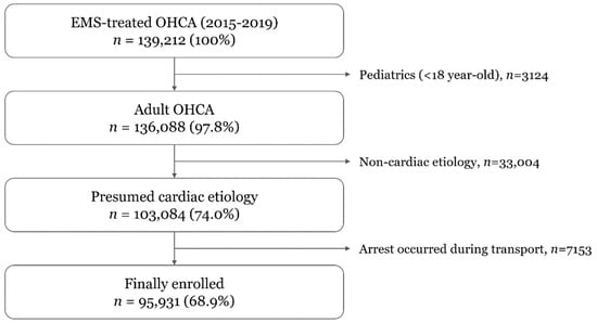 Among 139,212 EMS-treated OHCA cases that occurred within the study period, 95,931 (68.9%) met the inclusion criteria. We excluded patients who were younger than 18 years old (n = 3124), who had noncardiac etiology (n = 33,004), and those whose arrest occurred during transport (n = 7153) (Figure 1).