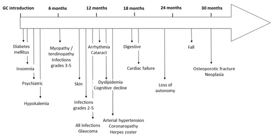 However, we retrieved some AEs after GC discontinuation due to their persistent effect, especially regarding the cardiovascular system, assuming endothelial injuries from arterial hypertension still remained; osteoporotic fractures; geriatric events; cataracts assuming the lack of clearance in this tissue; and possible neoplasia. Skin complications were analysed until a year after GC discontinuation assuming that this delay was necessary for the skin to no longer be affected.